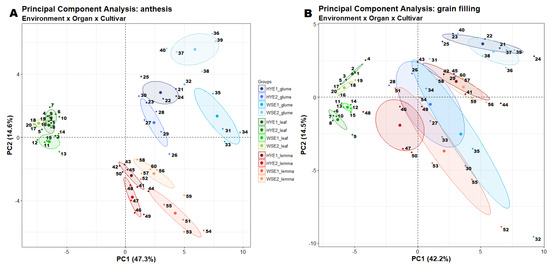Marked differences in the metabolite profiles were in part attributed to inter-organ and growth stage variability. At anthesis, the PCA (Figure 1) explained up to 61.9% of metabolome variance with samples being grouped according to the organ and growing environment. The separation between spike bracts and environments was less clear at grain filling. Several environments per organ and/or stage interactions were significant because metabolic changes were closely associated with the organ whereas many metabolites showed differential increasing or decreasing phenological patterns.