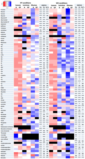 Heatmap of the metabolite profiles of leaves, lemmas and glumes at the anthesis (A) and grain filling (GF) stages under high-yielding (HY) and water stress (WS) conditions. p-values are shown for the organ (Po) and stage (Ps) factors and their interaction (Po*s). The red-blue color scale was obtained from Z-score transformation of actual values. Black indicates metabolites that were not detected. *, p < 0.05; **, p < 0.01; ***, p < 0.001.
