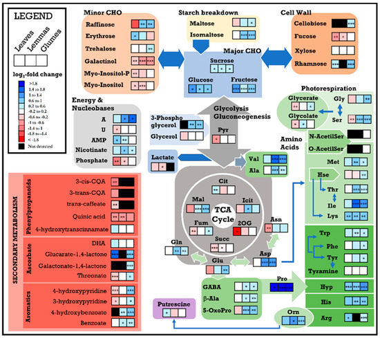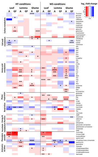 Water stress-induced changes in metabolite content at anthesis. Blue-red color scale represents log2-fold change, blue means higher metabolite content under water stress conditions and red stands for higher content under high-yielding conditions. Black indicates metabolites that were not detected. *, p < 0.05; **, p < 0.01; ***, p < 0.001.
