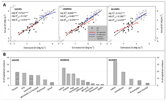 In the multiple regression models (using metabolites with DR ≥ 70%), the metabolite profiles of leaves, lemmas and glumes significantly predicted yield variability in the whole set of data at anthesis as well as in the WS and HY growing conditions, separately (Figure 5A). In this analysis, the lemma metabolome provided the most accurate yield prediction from its metabolite profile, explaining up to 83.9% of yield variability, followed by leaves (Adj-R2 = 0.764) and glumes (Adj-R2 = 0.712) for the whole set of data. Despite all regressions being significant, under WS the metabolite variability always enhanced the yield prediction accuracy compared to HY conditions.