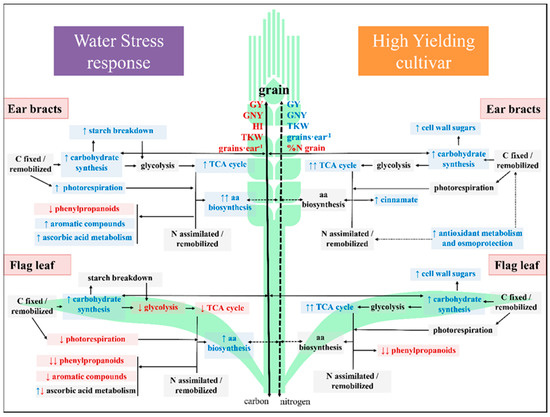 Illustration of the principal metabolic trends shown in leaves and spike bracts in response to water stress and in the high-yielding scenario. Blue and red colors refer to increasing and decreasing metabolic paths, respectively. Genotypic changes in yield components refer to the two-ways ANOVA by selecting the genotypes Pelayo and Don Sebastian only (data not shown). aa, amino acids; GNY, grain nitrogen yield; GY, grain yield; HI, harvest index; TKW, thousand kernel weight.