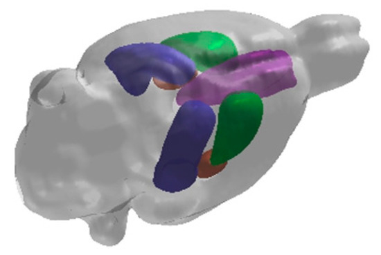 A representative 3D image of a rat brain which has been digitally reconstructed from magnetic resonance imaging (MRI) scans and depicts the medial prefrontal cortex (violet), caudate putamen (green), hippocampus (blue) and amygdala (brown).
