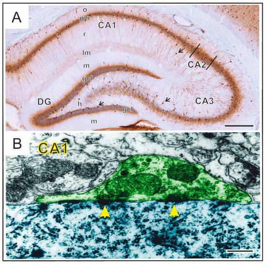 A representative microscopic image of the rat hippocampus (A). In this coronal section, the GABAergic perisomatic inhibitory neurons were visualized with parvalbumin-immunohistochemistry, see the numerous brown cells, some of them are indicated with arrows. Their dense axon fibers delineate the two distinct cell layers (gcl and pyr) formed by the granule cells (gcl) of the dentate gyrus and pyramidal neurons (pyr) of the CA1–3 areas. Abbreviations: o: stratum oriens; pyr: stratum pyramidale; r: stratum radiatum; lm: stratum lacunosum-moleculare; m: dentate molecular layer (stratum moleculare); gcl: granule cell layer (stratum granulosum); h: hilus proper; DG: dentate gyrus; CA1–3: Cornu Ammonis 1–3. A representative electron microscopy image of perisomatic contacts and inhibitory synapses in the CA1 area (B). The axon terminal (green) of an inhibitory neuron projects to the soma (blue) of a pyramidal cell. Synaptic densities are indicated with yellow arrowheads. Scale bars: 0.5 mm on A and 250 nm on B.