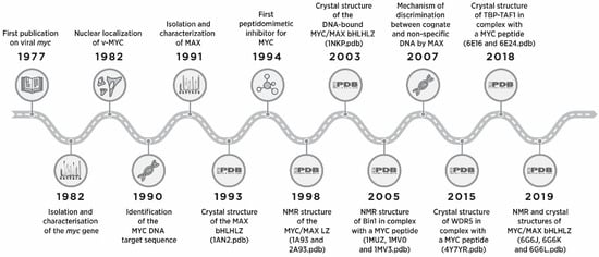 The MYC transcription factor (also known as c-Myc) regulates the expression of genes controlling the growth and proliferation of cells. MYC was discovered almost 40 years ago as the cellular homolog to v-myc, a viral oncogene from an avian myelocytomatosis virus that caused leukemia and sarcoma in chicken (Figure 1) [1,2]. Noticeably, v-myc was the first retroviral oncogene to be found in the cell nucleus [3,4,5], which hinted at its potentially direct role in gene regulation. Two additional human paralogs were eventually identified: MYCN (N-Myc) initially observed in neuroblastoma, and MYCL (L-Myc) identified in lung cancer samples [6,7]. Both were later found to be expressed in many additional tissues and tumor types, and the nuclear localization was confirmed for the all Myc family protein members (MYC, MYCL, and MYCN, from now on Myc). MYCN and MYCL display mostly overlapping functions with MYC although with a more limited tissue-specific expression pattern. All Myc proteins are frequently deregulated in human cancers, where their expression level generally correlate with tumor aggressiveness [8,9].