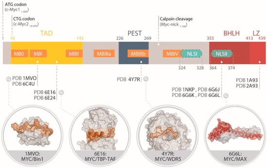 The Myc family members share a N-terminal transactivation domain (TAD) encompassing highly conserved transcriptional regulation elements called “Myc boxes” (MB), a central region, and a C-terminus basic region helix–loop–helix leucine zipper (bHLHLZ) domain (Figure 2) [12]. The bHLHLZ of MYC has been the most studied at the structural level, in part because the MYC transformation activity highly depends on it [10], and also because it is the only domain for which a predicted fold could be inferred from the sequence early on. Coherently, it has also represented the principal “hot spot” for drug design of MYC inhibitors so far [21]. The TAD constitutes a promiscuous region of Myc, interacting with hundreds of protein regulating chromatin remodeling, transcription and Myc stability [15]. Myc is also subject to a variety of PTMs including phosphorylation, ubiquitination, proline-isomerization, acetylation, glycosylation, and SUMOylation. These PTMs can cross-talk and even drive opposite effects in a context-dependent manner [14]. The human MYC polypeptide is 439 amino acids long, while MYCN (464 residues in total) and MYCL (364 residues) differ in the length of the non-conserved sequences [22]. From a pharmacological point of view, the functional redundancy and partially overlapping expression pattern of the three paralogs suggests that an efficient blockade of Myc function might require their simultaneous inhibition. For simplicity, in the following sections we will focus on the MYC sequence numbering.
