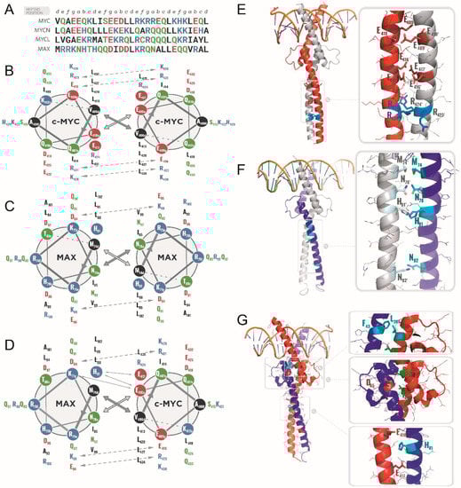 (A). Sequence alignment of the LZ of MYC, MYCL, MYCN, and MAX with heptad-repeat numbering. (B–D). Helical-wheel representation for the interfacial interactions in the LZ domains from MYC and MAX putative dimeric complexes: The MAX/MAX homodimer is shown in panel (B), the putative MYC/MYC homodimer in panel (C) and the MYC/MAX heterodimer in panel (D). The favorable and unfavorable inter-molecular contacts are displayed as arrows. The amino acids are colored blue for positively charge residues, red for negatively charged residues, green for polar residues and black for the remainder apolar residues. Adapted from Lavigne et al. 1995 [40]. (E,F) Molecular models of the tridimensional structure of a putative DNA-bound MYC homodimer (E), of the crystal structure of the MAX homodimer (PDB 1AN2, F) and of the MYC/MAX heterodimer (PDB 1NKP, G). (E). Homology model of a putative MYC/MYC homodimer (the sequence of MYC was superimposed on the MAX structure from 1NKP.pdb) with one monomer shown in red and the other in grey. The inset highlights the highly unfavorable electrostatic repulsions between the clusters of negatively charged interfacial residues Glu409-Glu410, Glu416-Glu417, and Arg423-Arg424 and their respective counterpart on the other monomer are shown with stick representation. Negatively charged residues are shown in red, positively charged residues in blue. F. Crystal structure of the MAX homodimer; the inset evidences the polar residues at interfacial a and d positions, namely Met74, Asn78, His81, Asn92 (shown in cyan stick representation). (G). Crystal structure of the MYC/MAX heterodimer with close up views on the MYC-Leu396/MAX-Phe43 interaction within the HLH (top inset); the Ser373 and Thr400 phosphorylation sites are shown in green (note: Asp65 from MAX, directly facing MYC-Ser373, is shown in red—middle inset); the interfacial, buried interaction between MAX-His81 (cyan) and MYC-Glu410 and Glu417 (in red) is shown (bottom inset).