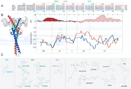 A third binding site (Site III, residues 375–385) was identified for the non-fluorescent compound 10074-A4 using a CD-based binding assay and shorter MYC bHLHLZ variant sequences [113]. Interestingly, there is very little similarity among the many “low micromolar affinity-displaying hits” identified by all those screening methods. Moreover, Hammoudeh et al. showed that the three sites can be bound simultaneously [113]. Panova et al. used CDT-NMR to build a perturbation/binding map for SM inhibitors, which describes the stabilizing tertiary interaction between residues 360–380 and 400–410 of MYC and 10058-F4, with the hope of improving the selectivity of this scaffold [55]. So far though, the SM deriving from the 10058-F4 appear to display very weak structure–activity relationship [107,114], with most compounds binding to MYC with similar micromolar range affinities. Of note, these sites on MYC are poorly conserved in MYCL and MAX, which in a way provides some basis for specificity (Figure 5).