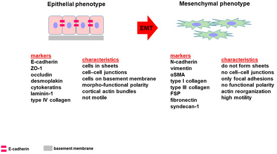 Figure 2. Diagram showing the morpho-functional phenotypic characteristics of epithelial and mesenchymal cells. The “proteome” related to EMT is based on the loss of some epithelial markers and the acquisition of a mesenchymal phenotype.
