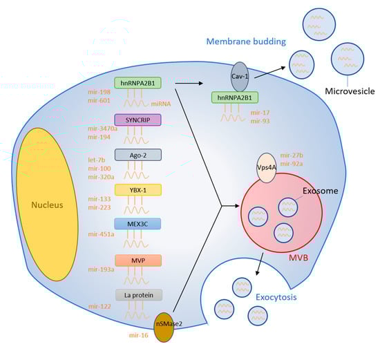 In this review, we will attempt to overview the current understanding of the miRNA sorting processes into EVs while demonstrating the areas still in need of further research. Specifically, we will identify the miRNAs involved in each sorting process and the underlying proteins driving each mechanism. This will be divided into a description of RNA-binding protein (RBP) mechanisms as well as membranous proteins involved in EV biogenesis. Finally, we will discuss the effect of certain disease states such as heart disease and diabetes mellitus (DM) on miRNA packaging.