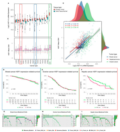 HSF1 mutation, CNV, and mRNA expression profiles across human cancers. (A) Box plots of HSF1 expression across different non-cancerous (blue) and cancerous tissues (red) in the TCGA cohort of cancer (https://gdc.cancer.gov/). RNA-seq mRNA expression values were log2 transformed and depicted to compare its expression distribution in normal and cancer tissues. For testicular germ cell tumors (TGCTs) and ovarian cancer (OV), normal tissue expression was not available. (B) Microarray CNV distribution of TCGA cancer samples is depicted in the same order as the expression data to evaluate the CNV occurrence in the different cancer types. Red, blue, and green rectangles indicate the expression and CNV status of liver hepatocarcinoma, breast cancer, and ovarian cancer, respectively. (C) Scatter plot and regression lines showing the correlation between CNV and RNA expression in tumor tissues of the three outlined cancer types. On the X and Y outer scatterplot margins, the HSF1 expression values of each cancer type and distribution of the HSF1 CNV is depicted, respectively, to assess the relationship between the evaluated values for each cohort. (D–F) shows Kaplan–Meier plots of the relationship between high and low expression levels of HSF1 in the liver, breast, and ovarian cancer cohorts. The population was divided according to the 50% percentile of HSF1 expression as the cutoff. A log-rank test was used to evaluate the statistical significance of the difference, and survival tables are shown below the plots to evaluate subjects at risk at each time point. (G–I) are Oncoplots, where each column represents a sample of the corresponding cancer type and each color represents a type of variant. For each cancer, the 10 genes with the highest number of mutations followed by the HSF1 gene (in maroon) are shown. Above, a small barplot shows the frequency of mutations for each sample, and in the right part, the percentage of samples that have the corresponding mutated gene. Variants annotated as Multi_Hit are those genes that are mutated more than once in the same sample. Abbreviations: CNV: Copy number variation. BLCA: Bladder Urothelial Carcinoma. BRCA: Breast invasive carcinoma. CESC: Cervical squamous cell carcinoma and endocervical adenocarcinoma. COAD: Colon adenocarcinoma. HNSC: Head and Neck squamous cell carcinoma. KIRC: Kidney renal clear cell carcinoma. LIHC: Liver hepatocellular carcinoma. LUAD: Lung adenocarcinoma. OV: Ovarian serous cystadenocarcinoma. PAAD: Pancreatic adenocarcinoma. PRAD: Prostate adenocarcinoma. STAD: Stomach adenocarcinoma. TGCT: Testicular Germ Cell Tumors. THCA: Thyroid carcinoma. UCEC: Uterine Corpus Endometrial Carcinoma.