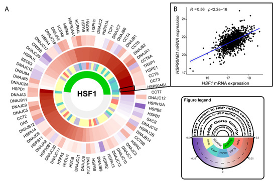 Relationship between HSF1 mRNA expression, HSF1 protein levels, and promoter occupancy with HSP mRNA levels in human breast cancer. (A) The circular plot shows the relationship between HSF1 mRNA expression, protein levels, and promoter occupancy across the different HSP genes in human breast cancer. In the inner circle, the green blocks show positive ChIP-seq peaks that were detected near the HSP genes’ respective regulatory regions (within 2500 bp of the transcription start site (TSS)). The transcription factor binding data was obtained from the UCSC genome browser (http://genome.ucsc.edu/) [69], and is derived from a large collection of ChIP-seq experiments performed by the ENCODE project between February 2011 and November 2018 [70,71]. In the following circle, a color key reflects the different HSP gene families according to Kampinga et al. [72]. The last two outer circles depict the Pearson’s correlation coefficients of the relationship between HSF1 (protein and mRNA) expression, and the respective HSPs mRNA expression levels in patients’ tumor samples. The patient protein expression data was obtained from the NIH-NCI Clinical Proteomic Tumor Analysis Consortium (CPTAC) data portal (https://cptac-data-portal.georgetown.edu/), specifically from the Cancer Genome Atlas Proteomic dataset. The mRNA expression levels were obtained from The Cancer Genome Atlas [73], downloaded from the NIH Genomic Data Commons portal (https://portal.gdc.cancer.gov/). (B) Example scatterplot of the relationship between HSF1 mRNA expression and HSP90AB1 mRNA expression.