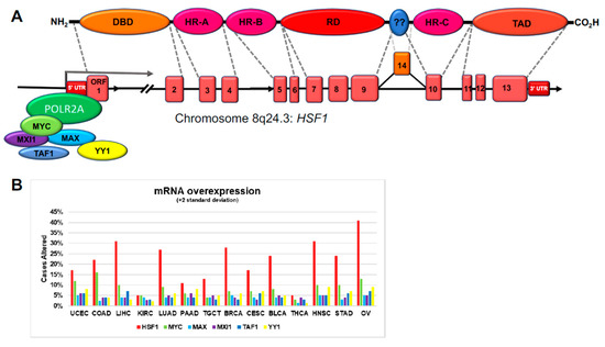 HSF1 functional domains and encoding gene structure, and amplification frequency of genes encoding HSF1 transcriptional regulators across human cancers. (A) Structure of the human HSF1 gene based on mRNA transcript (NM_005526.4) and protein (NP_005517.1). DBD; DNA-binding domain, HR-A; hydrophobic repeat A, RD; regulatory domain, TAD; transcriptional activation domain. Several transcription factors are found to bind within the RNA polymerase II (POLR2A) transcription start site (TSS) footprint according to ENCODE [138]. Data attained from the UCSC Genome Browser [161]. (B) HSF1 is overexpressed in a higher percentage of cancer cases across tumor types compared to other transcription factors, such as MYC. Data attained from cBioportal (OQL script “Gene: EXP>2”) [162,163].