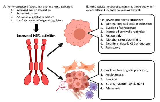 Summary of factors leading to HSF1 activation in cancer, and subsequent tumorigenic processes fostered by HSF1 activity. (A) Several features characteristic of cancer cells can lead to increased HSF1 activity. These include, as listed on the left of the figure, increased protein translation; proteotoxic stress; activation of HSF1 activators, such as MYC, Ras, mTOR, and Sirt1; and loss of negative regulators, including NF1, and FBXW7. (B) HSF1 has been shown to enable several cell-intrinsic tumorigenic processes, including the deregulation of cell cycle progression, aversion of senescence, cell survival, aneuploidy, metabolic reprogramming, dedifferentiated/CSC phenotypes, and resistance. In addition, HSF1 activity can modulate several tumorigenic features that manifest at the tumor tissue/microenvironmental level, including angiogenesis, invasion, or stromal activation. HSF1 has also been linked to the formation of metastatic tumors, possibly as a product of the above activities and/or through additional mechanisms yet to be elucidated. Figure created with Biorender.com.