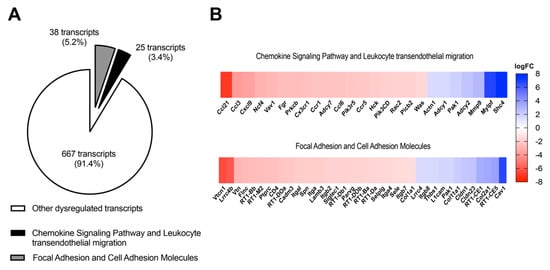 In vivo administration of MRS1754 reduces the transcriptional levels of genes related to chemokine/chemoattractant, cell adhesion, and maturation and function of monocyte/macrophage in the glomeruli of DN rats. (A) A total of 14,311 transcripts were analyzed by RNAseq, 730 of them were dysregulated and had a p-adjusted value equal or less than 0.05 in the glomeruli of MRS1754-treated DN rats. Thirty eight dysregulated transcripts were associated with focal adhesion and cell adhesion molecules (CAMs), and 25 transcripts related to the chemokine signaling pathway and leukocyte transendothelial migration were dysregulated. (B) Heatmap (logFC) of the top dysregulated transcripts related to the chemokine signaling pathway and leukocyte transendothelial migration and focal adhesion and CAMs in glomeruli of MRS1754-treated DN rats. Downregulated and upregulated genes in the heatmap are represented in red and blue, respectively.