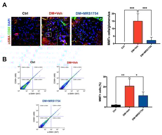 Macrophage–myofibroblast transition (MMT) has been reported as the main source of myofibroblasts in in vivo models of fibrotic kidney disease [34,38]. Since MRS1754 treatment decreases intraglomerular monocyte/macrophage infiltration, we investigated the effect of A2BAR blockade on MMT within the glomerulus. Immunohistofluorescence for CD68 (macrophage marker) and alpha-smooth muscle actin (α-SMA; myofibroblast marker) was performed in renal tissue of Ctrl, DM+Veh, and DM+MRS1754 rats. MMT+ was determined by quantification of double positive CD68 and α-SMA (CD68+/α-SMA+) cells. Inside the glomeruli of DM+Veh rats the number of MMT+ cells increased 15-fold (15 ± 2.21 cells per glomerulus) compared to Ctrl rats in which non double positive cells were observed (Figure 5A). In vivo treatment with MRS1754 decreased the number of MMT+ cells up to 2.2 ± 0.91 per glomerulus (Figure 5A).
