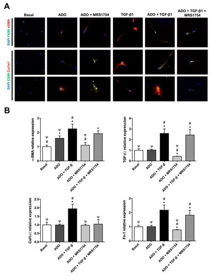 In vitro blockade of A2BAR decreased myofibroblast marker expression in macrophages. (A) Immunocytofluorescence of macrophage (F4/80 and CD68; green) and myofibroblast (α-SMA and Col1α1; red) markers in human macrophages cultured in Roswell Park Memorial Institute (RPMI) high D-glucose medium 0.5% FBS (basal) treated with 1 µM adenosine (ADO), 10 ng/mL TGF-β1, and 10 nM MRS1754 for seven days. DAPI (blue) was used as a counterstain. Cells selected from the image captured with a 400× magnification. (B) mRNA expression of myofibroblast markers α-SMA, TGF-β1, Col1α2, and Fn-1 by RT-qPCR in human macrophages cultured under basal condition, adenosine (ADO), TGF-β1, and MRS1754 for seven days. HPRT mRNA expression was used for normalization. Graphs represent the mean ± S.D. * p < 0.05 versus basal; # p < 0.05 versus ADO; Ψ p < 0.05 versus ADO + TGF-β1. n = 3.