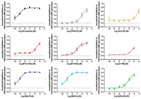 Concentration–response curves for FPR1-mediated inhibition of cAMP production. Cells were stimulated with forskolin (FSK) and the respective FPR1 agonists. Responses recorded 30 min after agonist addition were normalized to the maximum system response obtained with forskolin. Data points represent the mean ± SEM of at least 7 independent measurements.