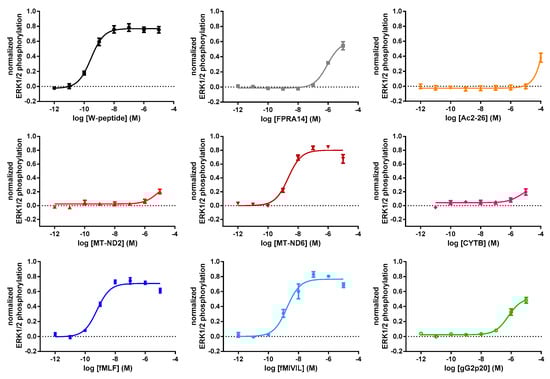 The MAPKinase cascade is a common effector of GPCR activation [39,40,41]. As shown in Figure 3, all agonists were able to increase ERK1/2 phosphorylation (exemplary raw data are shown in Figure A3b). Interestingly, the mitochondrial agonist MT-ND6 performed comparably to the bacterial agonists and the W-peptide, whereas the other mitochondrial peptides, as well as Ac2-26, only weakly activated ERK1/2 phosphorylation. As in the case of the adenylyl cyclase inhibition, gG2p20 and the synthetic small molecule FPRA14 displayed almost identical profiles. Spearman’s rank correlation uncovered a strong negative monotonic correlation between EC50 and Emax values (r = −0.8, p = 0.014, n 9).