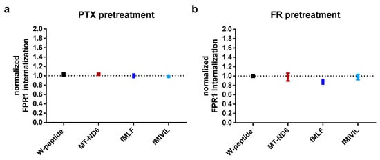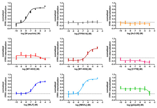 Activated GPCRs usually are removed from the cell surface and are internalized into endosomes [15,16]. To test the potential of our agonists to induce FPR1 internalization, we determined the agonist-dependent decrease in FPR1 cell surface presentation, based on the detection of the N-terminal FLAG-epitope by flow cytometry [42,43]. The actual amount of internalized receptor was calculated via the difference of cell surface signals measured in untreated and agonist-treated samples after 15 min of agonist addition. Administration of W-peptide, bacterial peptides fMLF and fMIVIL, or the endogenous mitochondrial peptide MT-ND6 decreased the cell surface-associated FPR1 pool in a concentration-dependent manner. In contrast to that, the mitochondria-derived peptides MT-ND2, CYTB, the synthetic agonist FPRA14, and the annexin A1 peptide Ac2-26 did not elicit detectable internalization and were therefore deemed non-responders. Importantly, no significant difference was observed between the two formylated ligands fMLF and MT-ND6, indicating that the source of signal (PAMP vs. DAMP) was not encoded by these ligands (Figure 4).