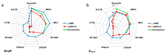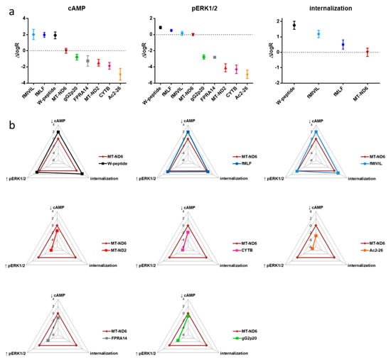 Relative agonist profiles compared to the endogenous reference agonist. (a) ΔlogR values were calculated from logR values with the mitochondrial peptide MT-ND6 as reference agonist. Data points represent the mean and 95% confidence intervals. (b) Relative agonist activities corresponding to the ΔlogR values for the respective pathways are depicted in radial graphs. Each radius is displayed in the logarithmic scale.