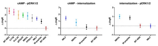 For the identification and analysis of ligand bias [23] associated with the FPR1 signaling axis, we selected the mitochondria-derived MT-ND6 as endogenous reference agonist for all tested pathways. For each agonist and pathway, we determined the corresponding logR (the logarithm of the activity ratio) values [24] and normalized the activities to MT-ND6 (ΔlogR=logRagonist-logRMT-ND6, see Table I) [23]. Figure 7 summarizes the resulting agonist ranking for each pathway. Overall, two agonist clusters were established: bacterial ligands, along with the W-peptide, which resembles a conserved spatial structure of bacterial agonists [44], constituted the group of “high-performers”. Endogenous mitochondria-derived agonists, the herpes virus-derived peptide, the small synthetic agonist FPRA14, and annexin A1 peptide Ac2-26 represented the second group of considerably lower activity (Figure 7a). Interestingly, the endogenous agonist MT-ND6 featured balanced characteristics, with a profile “in-between” both groups. Graphical representations of the intrinsic activity profiles, i.e., in terms of ΔlogR, further highlight the tendency of our tested ligands to segregate into two clusters, which was observed independently of pathway but in relation to the agonist origin (Figure 7b). However, the segregation was less pronounced when the magnitude of the respective response was taken into consideration (Figure 8, Figure A5, and Table A2). Analysis of pathway preferences, i.e., in terms of ΔlogR values, revealed that FPR1 activation was generally biased towards the inhibition of cAMP formation compared to the activation of the MAPKinase pathway or receptor internalization (Figure 9). However, the direct comparison of the weak agonist Ac2-26 with the strong agonist fMIVIL impressively revealed that bias was realized at different logistic levels (Figure 9).