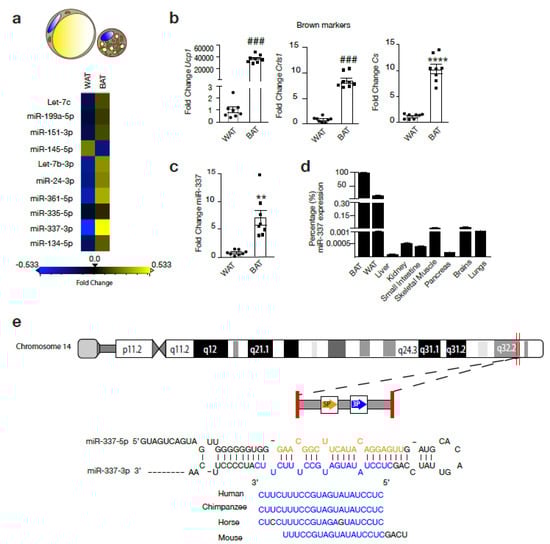 Figure 1. miR-337-3p is a potential regulator of browning of adipose tissue. (a) Representative heatmap showing the results of RT-PCR analysis used to screen a panel of microRNAs (miR) in mouse white adipose tissue (WAT) and brown adipose tissue (BAT): Let-7c, miR-199a-5p, miR-151-3p, miR-145-5p, Let-7b-3p, miR-24-3p, miR-361-5p, miR-335-5p, miR-337-3p, miR-134-5p. Real-time PCR was performed using the miRCURY LNA miR PCR Assay and normalized to U6 RNA and relative to WAT. Differentially expressed miR (fold change ≥0.5) are indicated in yellow, which represents upregulated miRNA in BAT compared to WAT, and in blue are the downregulated miRs (fold change ≤−0.5) in BAT compared to WAT. N = 3/group. (b) RT-PCR analysis of transcript abundance of BAT thermogenic and mitochondrial markers Ucp1, Cs, and Crls1 in BAT compared to WAT. mRNA expression values were normalized to L7 mRNA. N = 8/group. (c) RT-PCR analysis of mmu-miR-337-3p expression in mouse WAT and BAT normalized to U6 RNA. N = 8/group (d) RT-PCR analysis of mmu-miR-337-3p abundance in BAT, WAT, liver, kidney, small intestine, skeletal muscle, pancreas, brains, and lungs presented as percentage of mmu-miR-337-3p transcript abundance from its expression in BAT. Expression of miR-337-3p in BAT is set to 100%. (e) Representative image of the genomic mapping of miR-337-3p in humans and conservation of its seed sequence among species. Data are presented as means ± SEM; individual data points are given by the dot plot. Either Mann–Whitney-U or Independent sample t-test was used to assess differences in expression levels. ### p < 0.001 Mann–Whitney-U, ** p < 0.01 **** p < 0.0001 Independent sample t-test, equal variances not assumed. n, number of biological replicas; WAT, white adipose tissue; BAT, brown adipose tissue; Ucp1, uncoupling protein-1; Crls1, cardiolipin synthase 1; Cs, Citrate synthase; RT-PCR, quantitative real time-polymerase chain reaction.