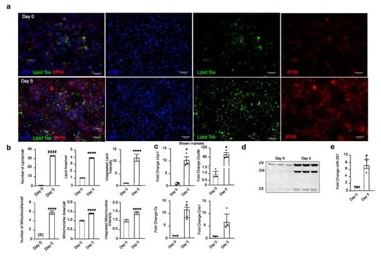 Figure 2. miR-337-3p is upregulated in browning. (a) Representative microscopic images of immunofluorescent stainings from day 0 and day 5 of mouse brown adipocyte differentiation for mitochondria (red) ATPB, lipid droplets (green) Lipidtox, and nuclear (blue) DAPI. The scale bar in the figures corresponds to 40µm. (b) Quantifications of number, integrated intensity, and area of mitochondria and lipids corrected per cell of day 0 and day 5 of mouse brown adipocyte differentiation. (n = 6 per group) (c) RT-PCR analysis of BAT thermogenic and mitochondrial markers, Ucp1, Cox8b, Cs, and Crls1 of day 0 and day 5 of mouse brown adipocyte differentiation. L7 mRNA was used as an internal normalizer to the number of mRNA transcript copies. n = 3 per group. (d) Western blot analysis of Complex V (ATP5A-55kDa), III (UQCRC2-48 kDa), and II (SDHB-30kDa) of the electron transport chain of OXPHOS in day 0 and day 5 of mouse brown adipocyte differentiation. (e) RT-PCR analysis of mmu-miR-337-3p in day 0 and day 5 of mouse brown adipocyte differentiation, normalized to U6 RNA. N = 3/group. All immunofluorescent quantifications are presented as medians ± SD, while quantifications of RT-PCR analysis are presented as means ± SEM, and individual data points are given by the dot plot. An Independent sample t-test was used to assess differences in expression levels. * p < 0.05; **** p < 0.0001 by Independent sample t-test, equal variances not assumed. #### p < 0.0001 Independent sample t-test equal variances assumed. n, number of biological replicas; ATPB, β-subunit of ATP synthase; Ucp1, uncoupling protein-1; OXPHOS, oxidative phosphorylation; Cox8b, cytochrome C oxidase subunit 8b; Cs, citrate synthase; Crls1, cardiolipin synthase 1.