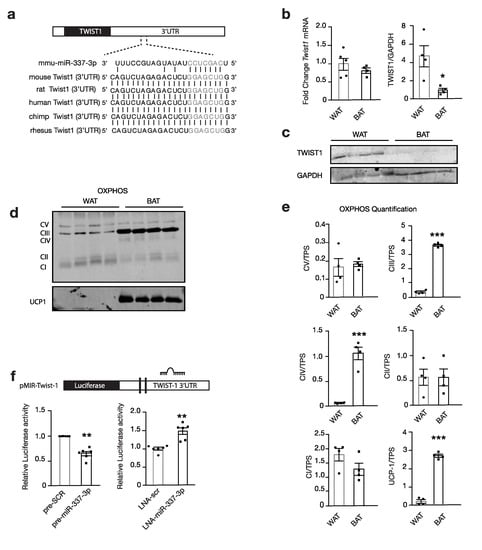 Twist1, a class I basic helix–loop–helix transcription factor and negative feedback regulator of PPARGC1A/PPARD-mediated brown fat metabolism, was identified as a propitious target for modulating brown fat metabolism. We hypothesized that miR-337-3p targets Twist1 and thereby, prevents the inhibition of brown fat metabolism (Figure 3a) [16]. Indeed, we found TWIST1 protein abundance to be significantly increased in murine WAT compared to BAT by Western blot analysis, and the inverse of the expression pattern of miR-337-3p (Figure 1c and Figure 3b–c). In line, the seed sequence of miR-337-3p shows perfect complementarity with Twist1-3′UTR and is evolutionarily conserved (Figure 3a). The expression of OXPHOS Complex III and Complex IV and UCP1 were increased in BAT compared to WAT, which is inverse to TWIST1 protein abundance (Figure 3c–e).