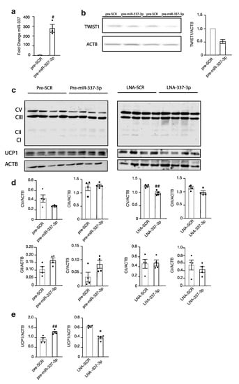 Figure 4. Modulation of miR-337-3p influences Twist1 and downstream thermogenic proteins. (a) RT-PCR analysis of mmu-miR-337-3p in murine brown adipocytes transfected with either precursor mmu-miR-337-3p or precursor scrambled molecule. (b) Western blot analysis of Twist-1 protein abundance of precursor mmu-miR-337-3p or precursor-scrambled transfected brown adipocytes and its quantification on the right (n = 2). (c) Western blot analysis of OXPHOS, Complex V-I, UCP1, and ACTB in brown adipocytes transfected with (left panel) either precursor mmu-miR-337-3p or precursor scrambled, or (right panel) transfected with LNA mmu-miR-337-3p inhibitor or scrambled inhibitor (n = 4 per group). (d) Quantification of OXPHOS Complex V-I protein abundance from (c) Western blot (e) Quantification of UCP1 protein abundance from (c) Western blot. Data are presented as means ± SEM, and individual data points are given by the dot plot. # p < 0.05, Independent sample t-test, equal variances not assumed * p < 0.05 Mann–Whitney-U for independent samples. ## p < 0.01, Independent sample t-test with equality of variances. n, number of biological replicas; OXPHOS, oxidative phosphorylation; UCP1, uncoupling protein 1; ACTB, beta-actin RT-PCR, quantitative real-time polymerase chain reaction.