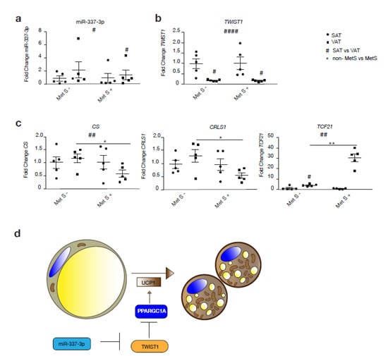 Figure 5. The miR-337-3p and Twist1 axis is disrupted in human subjects with MetS. (a) RT-PCR analysis of hsa-miR-337-3p in human VAT and SAT from non-MetS and MetS human subjects (n = 5/group). (b) RT-PCR analysis of TWIST1 in human VAT and SAT from non-MetS and MetS human subjects (n = 5 per group). (c) RT-PCR analysis of TCF21 and mitochondrial genes CRLS1 and CS in VAT and SAT from non-MetS and MetS human subjects (n = 5 per group). (d) Illustration of the pathway proposed in the present study through which miR-337-3p induces browning of adipose tissue. TWIST1, when activated, inhibits PPARGC1A, which prevents the transcription of genes involved in brown fat metabolism. In summary, miR-337-3p induces translational inhibition of TWIST1 and prevents transcriptional inhibition of genes involved in the browning of adipose tissue. Data are presented as means ± SEM, and individual data points are given by the dot plot. L7 mRNA was used as an internal normalizer to the number of mRNA transcript copies. 5S RNA was used as an internal normalizer to miRNA transcript copies. # p < 0.05; ## p < 0.01; #### p < 0.0001; Paired sample t-test (SAT vs. VAT) * p < 0.05; ** p < 0.01 Independent sample t-test (non-MetS vs. MetS), n, number of biological replicas; † VAT, visceral adipose tissue; SAT, subcutaneous adipose tissue; MetS, metabolic syndrome, TCF21, transcription factor 21; CS, citrate synthase; CRLS1, cardiolipin synthase 1;PPARGC1A, peroxisome proliferator-activated receptor-gamma coactivator-1 alpha; UCP1, uncoupling protein 1.