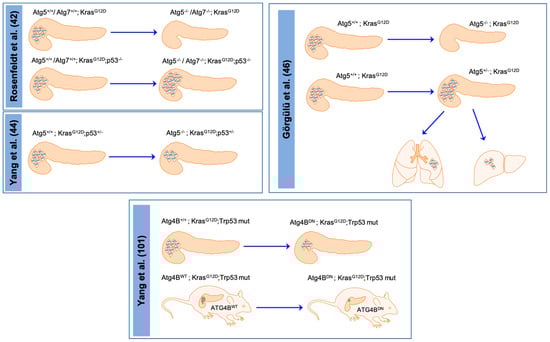 Recent in vivo studies showing the role of autophagy in genetically modified mouse models (GEMMs) of pancreatic cancer. Rosenfeldt et al. showed that homozygous deletion of Atg7 or Atg5 halts cancer development in the Kras-mutated murine PC model. However, the same genetic alterations increase cancer aggressiveness in the Kras-mutated p53 deleted PC murine model [47]. At the same time, Yang et al. showed that autophagy acts as a tumor promoter in the Kras-mutated p53 heterozygous murine PC model [49]. Following these studies, Görgülü et al. showed that monoallelic deletion of Atg5 increased cancer incidence and metastatic dissemination in the Kras-mutated murine PC model. Later on, Yang et al. proved that compartment specific autophagy inhibition by Atg4b in cancer cells or the whole body suppresses cancer growth [52].