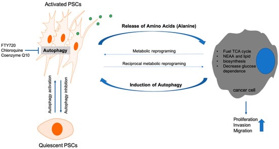 Recently, research has focused on the underlying mechanisms of PSC-activation and their effect on pancreatic tumorigenesis. Specifically, autophagy activation in PSCs seems to be a critical step during transformation from the quiescent to the active state. A previous study showed that genetic inhibition of autophagy in PSCs leads to increased lipid droplet count and decreased αSMA expression and thus retention of the quiescent PSC-state. Similarly, autophagy inhibition upon CQ-treatment [82], coenzyme Q10 [83], and FTY720, a structural analogue of sphingosine-1-phosphate (S1P) [84], blocks PSC-activation by suppressing AMPK and activating mTOR. Consequently, changes in MMP/TIMP-ratio and decreased TGB-1 expression lead to ECM-degradation and fibrosis attenuation [85]. Autophagy seems to be required to meet the high-energy demands of activated PSCs, characterized by hyper-secretion and hyper-proliferation [86].