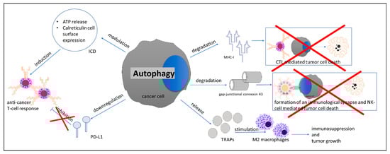 Autophagy in cancer cells can facilitate cancer immune evasion, vesicle-mediated immune suppression, regulate programmed cell death 1 ligand 1 (PD-L1) expression, and influence immunogenic cell death (Figure 3). Along these lines, immune evasion can be modulated by autophagy through major histocompatibility complex I (MHC-I) expression in cancer cells [93,94,95]. It seems to be context-dependent, e.g., on tumor stage and/or immune phenotype, whether autophagy leads to MHC-I degradation or expression. For example, the autophagy-mediated MHC-I reduction seen in melanoma cells can be reversed through the addition of interferon-γ (IFN-γ) [96]; a finding supported in non-small-cell lung carcinoma (NSCLC), where radiotherapy-induced autophagy and IFN-γ secretion stimulated MHC-I expression in cancer cells and increased cytotoxic T-lymphocyte (CTL) infiltration [97]. Furthermore, autophagy was shown to inhibit the formation of an immunologic synapse between melanoma and natural killer (NK) cells through degradation of gap-junctional connexin 43 [98], thus reducing sensitivity towards NK-cell mediated lysis. Moreover, autophagy inhibition was shown to increase sensitivity towards CTLs [99]. Tumor cell-released autophagosomes (TRAPs) were shown to facilitate immunosuppression through induction of M2-like macrophages characterized by increased expression of PD-L1 and IL-10. TRAP-induced macrophages subsequently inhibited T-cell proliferation and promoted tumor progression through PD-L1 [100].