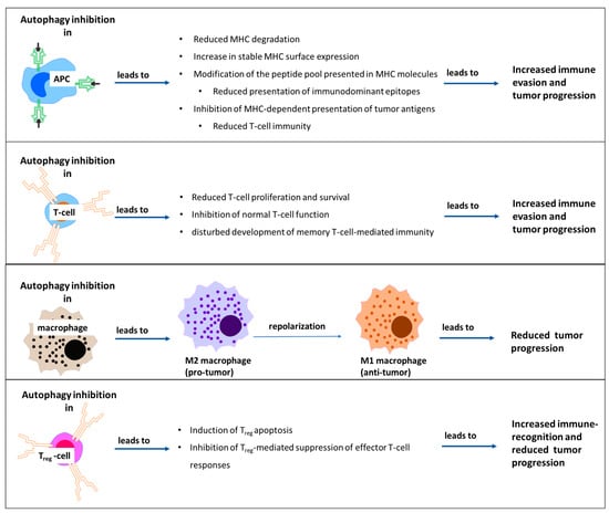 Autophagy in immune cells can influence normal T-cell function, macrophage polarization, and regulatory T-cell (Treg) immunosuppression (Figure 4). Regarding T-cell function, autophagy inhibition enhanced stable surface expression of MHC molecules, but it also modified the peptide pool displayed on MHC diminishing the presentation of immunodominant epitopes. As a result, autophagy positively affected tumor antigen presentation and to an extent T-cell immunity [93,101,102]. Furthermore, autophagy was shown to be crucial for the maintenance of mitochondrial homeostasis and the degradation of proapoptotic and antiproliferative proteins thus ensuring T-cell survival, function, and memory T-cell formation [93].