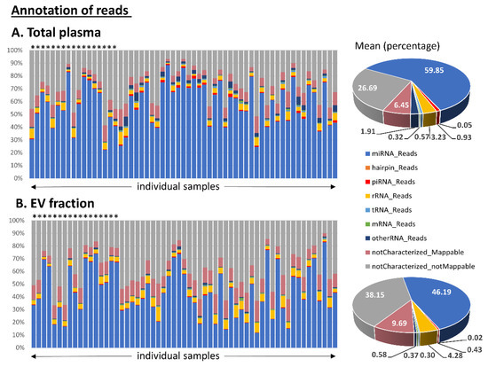 Annotation of small RNA-seq data outputs of (A) total plasma samples and (B) samples from corresponding extracellular vesicles (EVs). The read percentage was calculated from the total number of annotated read counts after quality control filtering. Healthy control samples are marked with stars above the bars. The pie charts show the mean distribution of reads in the two types of material.