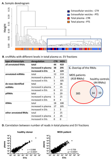 Characterization of circulating small noncoding RNA (sncRNA) profiles of total plasma vs. EVs. (A) Hierarchical cluster analysis of samples based on all RNA-seq data. The blue frame highlights the clustered extravesicular samples. CTR—healthy controls, PTS—MDS/AML patients. (B) SncRNAs with different levels between total plasma and paired EV samples. Only the RNAs with |logFC| >1 and q < 0.05 were considered. (C) The overlap of the RNAs between MDS patients and healthy controls. (D) Correlation between normalized number of reads in total plasma vs. paired EV samples in a typical healthy control or an MDS patient.