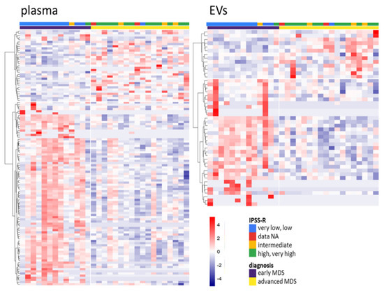 To obtain a better insight into changes of molecular profiles specific for MDS in comparison with healthy controls, we focused on the levels of individual miRNAs and observed that the majority of them were increased in both plasma and EVs of MDS patients. Among these, we found many miRNAs whose intracellular deregulation has already been associated with various hematopoietic disorders, including MDS, such as miR-34a, miR-125a, miR-99b, miR-10a, miR-221, miR-222, miR-223, miR-29a, and miR-150 [44,45]. Although the physiological roles of circulating miRNAs and the impact of their deregulation are still unclear, there is convincing evidence of their intracellular regulatory functions in hematopoiesis and its pathogenesis.