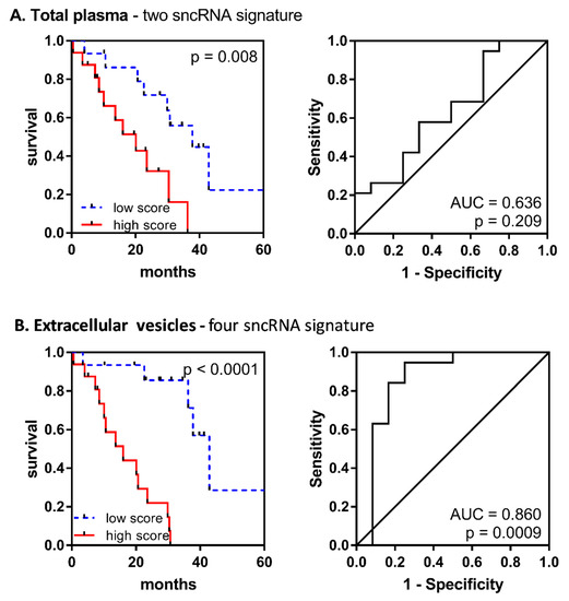 To evaluate the performance of combined prognostic signatures, Kaplan–Meier curves and receiver operation characteristic (ROC) curves were plotted for the samples divided into high- and low-risk groups according to the computed score formulas. The results showed that combining sncRNA level scores increased the predictive power of the survival risk model more significantly in EV material (univariate p < 0001, ROC: AUC = 0.860, p = 0.0009) than in total plasma (univariate p = 0.008, ROC: AUC = 0.636, p = 0.206) (Figure 4).