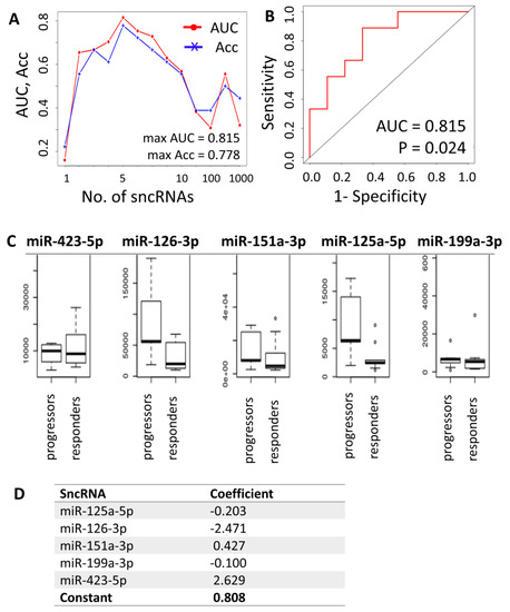 The sncRNAs preselected by differential expression analysis (miR-125b-5p, miR-4324, and miR-4774-3p) and the sncRNAs with the best cumulative predictive value in the SVM model (miR-423-5p, miR-126-3p, miR-151a-3p, miR-125a-5p, miR-199a-3p, miR-142-5p, Ro-associated RNA, miR-185-5p, miR-30d-5p, miR-92a-3p, let-7a-5p, let-7f-5p, and miR-26b-5p) for total plasma samples of responders vs. progressors were further statistically tested together by logistic regression analysis using maximum likelihood estimation, and their number was reduced to five (miR-423-5p, miR-126-3p, miR-151a-3p, miR-125a-5p, and miR-199a-3p), which was in agreement with the SVM method. With these five miRNAs, the following predictive formula was calculated (Figure 5D):