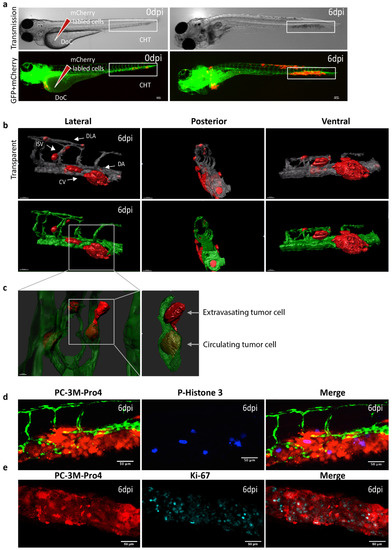 Androgen-independent osteotropic PC-3M-Pro4-mCherry cells (300–500 cells) were intravenously injected into the duct of Cuvier (DoC) of tg(Fli:GFP) endothelial reporter transgenic zebrafish line with fluorescent vasculature at 2 d post fertilization (dpf) (Figure 1a) [32]. DoC is an open blood circulation channel connecting the heart and the trunk vasculature. Immediately after transplantation, cells hematogenously disseminated through the whole circulation. Most of the circulating cells regressed without extravasation and initiating tumor growth. However, exclusively at the posterior ventral end of caudal hematopoietic tissue (CHT), perivascular cells were able to extravasate and invade into tail fin within 1 d and developed perivascular metastatic lesions within 6 d (Figure 1a,b). CHT is a ZF hematopoietic organ at the early developmental stage with a certain molecular and cellular similarity to mice bone marrow [30,34]. To image cellular details of the metastatic phenotype, at 6 d post injection (dpi), high-resolution imaging was performed using a Light-sheet Confocal microscope (Figure 1b,c). This image proved that single cancer cells circulated in the blood flow and extravasated from intersegmental vessel (ISV), dorsal longitudinal anastomotic vessel (DLV), dorsal vein (DA) and caudal vein (CV) (Figure 1c). The metastatic tumor growth around CHT was characterized using immunofluorescence. Abundant phosphorylated Histone3-positive cells and Ki-67-positive cells were detected (Figure 1d,e), indicating that expended red fluorescent signal is indeed due to proliferation of PCa cells at the metastatic site. This novel experimental metastatic assay bypasses the primary tumor stage and intravasation but opens the possibility to image and study the mechanisms controlling metastatic initiation of PCa cells in a few days, instead of weeks, in rodent models.