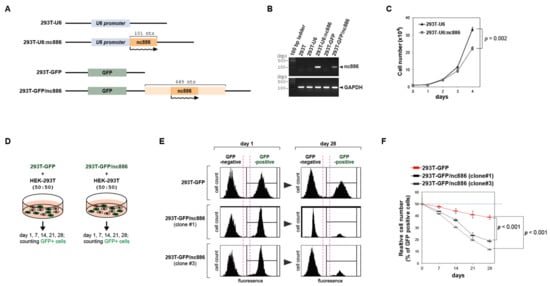 The plasmid “pLPCX-U6” was constructed by inserting the U6 promoter into the pLPCX vector (Clontech Laboratories Inc., Mountain View, CA, USA) and “pCAGGS-GFP” was constructed by subcloning of the green fluorescent protein (GFP) gene into the pCAGGS vector. We inserted nc886 DNA fragments (101-nt long and 649-nt long, as depicted in Figure 1A) into these control vectors (“pLPCX-U6” and “pCAGGS-GFP”), to generate nc886-expressing plasmids (“pLPCX-U6:nc886” and “pCAGGS-GFP/nc886” respectively). We transfected these plasmids into HEK-293T cells by Lipofectamine™ 2000 reagent (Invitrogen, Carlsbad, CA, USA), isolated clones by a standard laboratory protocol, and established nc886+ stable lines or nc886− control cell lines (for their names, see Figure 1A). The detailed information about plasmids and the protocol is available upon request.