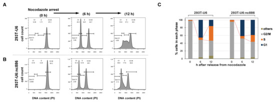 We hypothesized that the retarded growth of nc886+ cells was due to a delay in a particular phase in the cell cycle [14]. To test this idea, we examined cell cycle profiles by flow cytometry, after treating asynchronously growing cells with nocodazole, a microtubule inhibitor (Figure 2A). Upon nocodazole treatment, cells were synchronized at the G2/M phase, as confirmed by a single peak at the DNA content of 2n. At 6 h after removal of nocodazole, another peak at the 1n position appeared, indicating that cells were released from G2/M and entered into the G1 phase. nc886+ and nc886− cells displayed a nearly identical pattern at this time point. At 12 h, nc886− cells progressed further to the S phase and this progression was delayed in the case of nc886+ cells (the 293T-U6 and 293T-U6:nc886 pair in Figure 2; the 293T-GFP and 293T-GFP/nc886 pair in Figure S3). Our data indicated that nc886 procrastinated the G1-to-S transition but did not affect the G2/M-to-G1 transition. The extended G1 duration of nc886+ cells explains why they proliferated more slowly than nc886− cells.