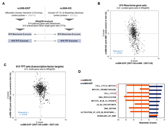 Pathway analyses from the array data of nc886-EXP and nc886-KD. (A) Summary of array platforms and analysis workflow. (B) A scatter plot of Z-scores for 674 Reactome gene sets that shows the correlation between nc886-EXP (x-axis) and -KD (y-axis). (C) A scatter plot of Z-scores for 615 transcription factors (TFs) target gene sets (TFTs), as described in panel B. (D) A bar graph showing Z-scores for Reactome gene sets. Nine pathways with a significantly enriched Z-score (>3) were selected from nc886-EXP and were plotted together with Z-scores of nc886-KD.