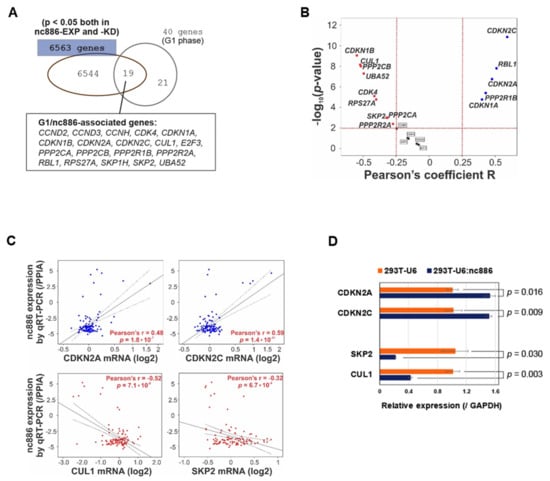 Upon scrutinizing the 14 genes, we chose CDKN2A (also known as p16INK4a or p14ARF), CDKN2C (also known as P18-INK4C or P18-INK6), SKP2, and CUL1 for further assessment. CDKN2A and CDKN2C restrict cells at G1 by inhibiting CDK4/CDK6, whereas SKP2 and CUL1 promote the G1-S transition by degrading CDK inhibitors [15]. In line with our earlier finding that nc886− cells are more proficient at G1-S transition than nc886+ cells, the expression of CDKN2A and CDKN2C was positively correlated with nc886 in the 108 ESCC patients (Figure 4C) and was also upregulated in 293T-U6:nc886 cells (Figure 4D). In the case of SKP2 and CUL1, they were negatively associated with nc886 (Figure 4C,D).