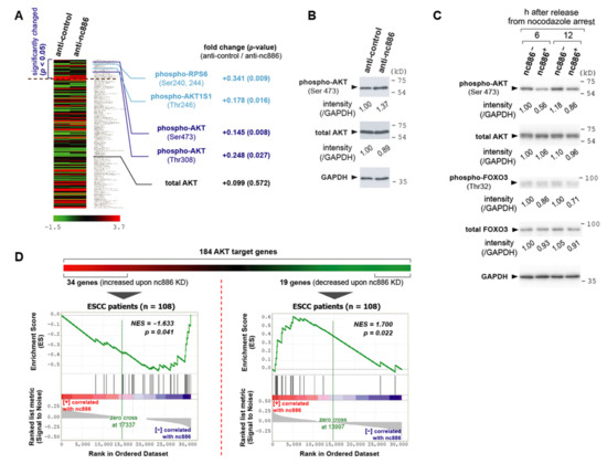 nc886 suppresses the AKT pathway. (A) A heat map showing the reverse-phase protein arrays (RPPA) data from nc886 KD of an ESCC cell line, TE1. RPPA values of a total of 172 proteins were sorted by p-values in descending order, to locate significantly (p < 0.05) changed 23 proteins on the top. Fold change and p-values are shown for phospho- and total-AKT as well as AKT target proteins. (B) Western blot of phospho- and total-AKT together with GAPDH as a loading control after nc886 KD. Each indicated anti-oligo was transfected into an ESCC cell line, TE-8, and cells were harvested at 48 h after transfection. Each band was quantified with AlphaView software 2.0.1.1 (Alpha Innotech Corp, Santa Clara, CA) and normalized as indicated. (C) Western blot as described in panel B. nc886− and nc886+ designate 293T-U6 and 293T-U6:nc886 cells respectively. These cells were synchronized by nocodazole, released from G2/M arrest, and harvested at indicated times afterward. (D) GSEA to determine whether a priori defined set of AKT genes in nc886 KD shows statistical concordance in ESCC patients according to nc886 expression.