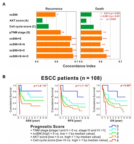 Prognostic value of nc886 and its associated AKT and cell cycle genes. (A) Concordance index showing that the combination of nc886, AKT signature score, cell cycle signature score, and tumor-node-metastasis (TNM) staging had the most powerful predictor of recurrence and survival. (B) Stratification by prognostic score, which is calculated as the sum of the TNM stage (score 0 for stage I and II vs. score 1 for stage III and IV), the nc886 expression (score 0 vs. 1 respectively for high vs. low expression divided by the median value), the AKT signature score (score 0 vs. 1 for low vs. high by the median value), and the cell cycle score (score 0 vs. 1 for low vs. high by the median value), showing distinct disease-specific survival (DSS), recurrence-free survival (RFS), and overall survival (OS) curves in ESCC patient cohort.