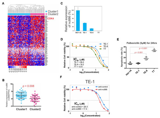 As a backward approach to proving the association of nc886 with the AKT target genes (Table S5) and cell cycle genes (Figure 4A), we performed unsupervised clustering of the 108 patients with those genes (Table S8), to identify two distinct clusters termed “Cluster1” and “Cluster2” (Figure 7A). Cluster2 was featured by enrichment of the majority of genes including CDK4 (Figure 7A) and lower expression of nc886 (Figure 7B). Some cancer drugs target cell cycle genes [23]. For example, palbociclib is an FDA-approved CDK4/6 inhibitor. Therefore, we interrogated whether nc886 expression, which was associated with CDK4, could predict an ESCC cell’s response to palbociclib. When compared to non-malignant Het-1A cells, nc886 expression was moderate in TE-1, low in TE-8, and silenced in TT (Figure 7C). We treated titrating amounts of palbociclib in these three ESCC cell lines and found the order of IC50 values to be TE-1 > TE-8 > TT (Figure 7D). In line with the IC50 data, the apoptosis rate was highest in TT and higher in TE-8, as compare to TE-1 (Figure 7E). Our experimental data were consistent with palbociclib sensitivity information from a public database (Figure S6) and suggested that cells were more sensitive to palbociclib when nc886 expression was low. To prove the causal link between nc886 expression and palbociclib sensitivity, we performed nc886 KD before palbociclib treatment. TE-1 cells transfected with anti-nc886 had a lower IC50 value than anti-control (Figure 7F). All of our data, which were in concordant with our earlier finding that nc886-silenced ESCC cells had a higher CDK activity, provides a potential utility of nc886 as a predictive marker for ESCC patients when palbociclib treatment is considered.