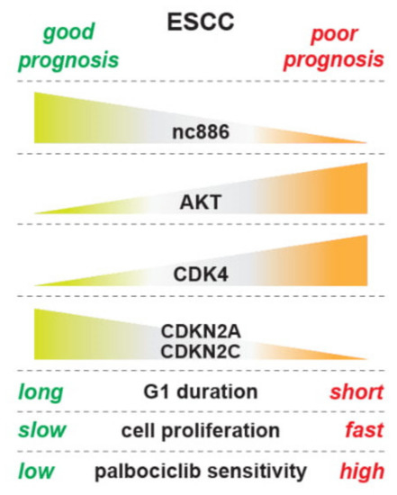 Esophageal cancer (EC) is one of the deadly cancers. Worldwide, EC ranks eighth in the incidence rate and sixth in disease-associated death [4]. Esophageal squamous cell carcinoma (ESCC) is the major histological subtype of EC, especially in East Asian countries. A therapeutic strategy to combine surgery, chemotherapy, and radiotherapy has improved the survival of ESCC patients. Nonetheless, the five-year overall survival (OS) is no higher than 20%, mostly because it is challenging to identify ESCC patients at a high risk of recurrence. This poor prognosis calls attention to the need for reliable molecular markers. Considerable efforts have been made to identify prognostic biomarkers, which include cyclooxygenase-2, vascular endothelial growth factor, survivin, and inhibitors for cyclin-dependent kinases (CDKs) (reviewed in [5]). We have recently identified nc886 to be a promising prognostic marker in ESCC, by showing that nc886 silencing in ESCC patients is associated with their short survival [6,7].