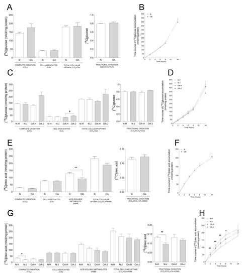 Basal glucose and fatty acid metabolism. Cybrids were cultured for 48 h in DMEM-glu (A–D, i.e., DMEM 5.5 mM glucose) or DMEM-ole (E–H, i.e., DMEM no glucose supplemented with 100 µM oleic acid). Thereafter, basal glucose and oleic acid metabolism were evaluated using D-[14C(U]glucose (0.5 µCi/mL, 200 µM) or [1-14C]oleic acid (0.5 µCi/mL, 100 µM), respectively, and 4 h substrate oxidation assay (A, C, E, and G) or 24 h SPA (B, D, F, and H). (A,B) Basal glucose metabolism in healthy (N) and osteoarthritic (OA) cybrids. (C,D) Basal glucose metabolism in cybrids carrying haplogroups H or J. (E,F) Basal oleic acid metabolism in N and OA cybrids. (G,H) Basal oleic acid metabolism in cybrids carrying haplogroups H or J. N and OA data included the values for haplogroups H and J combined. All data were obtained from three independent experiments, each with four replicates and two clones per donor. Values are presented as mean ± SEM in nmol/mg protein. * Statistically significant difference between N and OA cybrids (** p ≤ 0.005, unpaired t-test). # Statistically significant difference between haplogroups (# p ≤ 0.05, ## p ≤ 0.005, Mann–Whitney test).