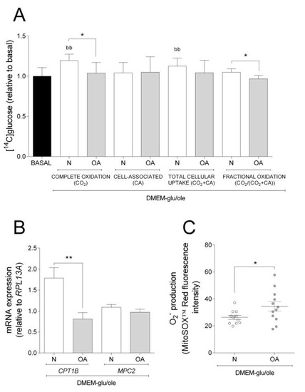 Effect of oleic acid on glucose metabolism, mRNA expression, and O2− production. Effect of culturing cells in DMEM-glu/ole (i.e., DMEM 5.5 mM glucose supplemented with 100 µM oleic acid) compared to DMEM-glu (basal, i.e., DMEM 5.5 mM glucose). (A) Glucose metabolism. (B) mRNA expressions of carnitine palmitoyltransferase 1B (CPT1B) and mitochondrial pyruvate carrier 2 (MPC2) normalized to the expression of RPL13A. (C) Anion superoxide production (O2−). N and OA data included the values for haplogroups H and J combined. All data were obtained from three independent experiments, each with four replicates and two clones per donor. Values are presented as mean ± SEM relative to basal. * Statistically significant difference between N and OA cybrids (* p ≤ 0.05, ** p ≤ 0.01, unpaired t-test). b Statistically significant versus basal (bb p ≤0.01, paired t-test). N, healthy cybrids; OA, osteoarthritis cybrids.